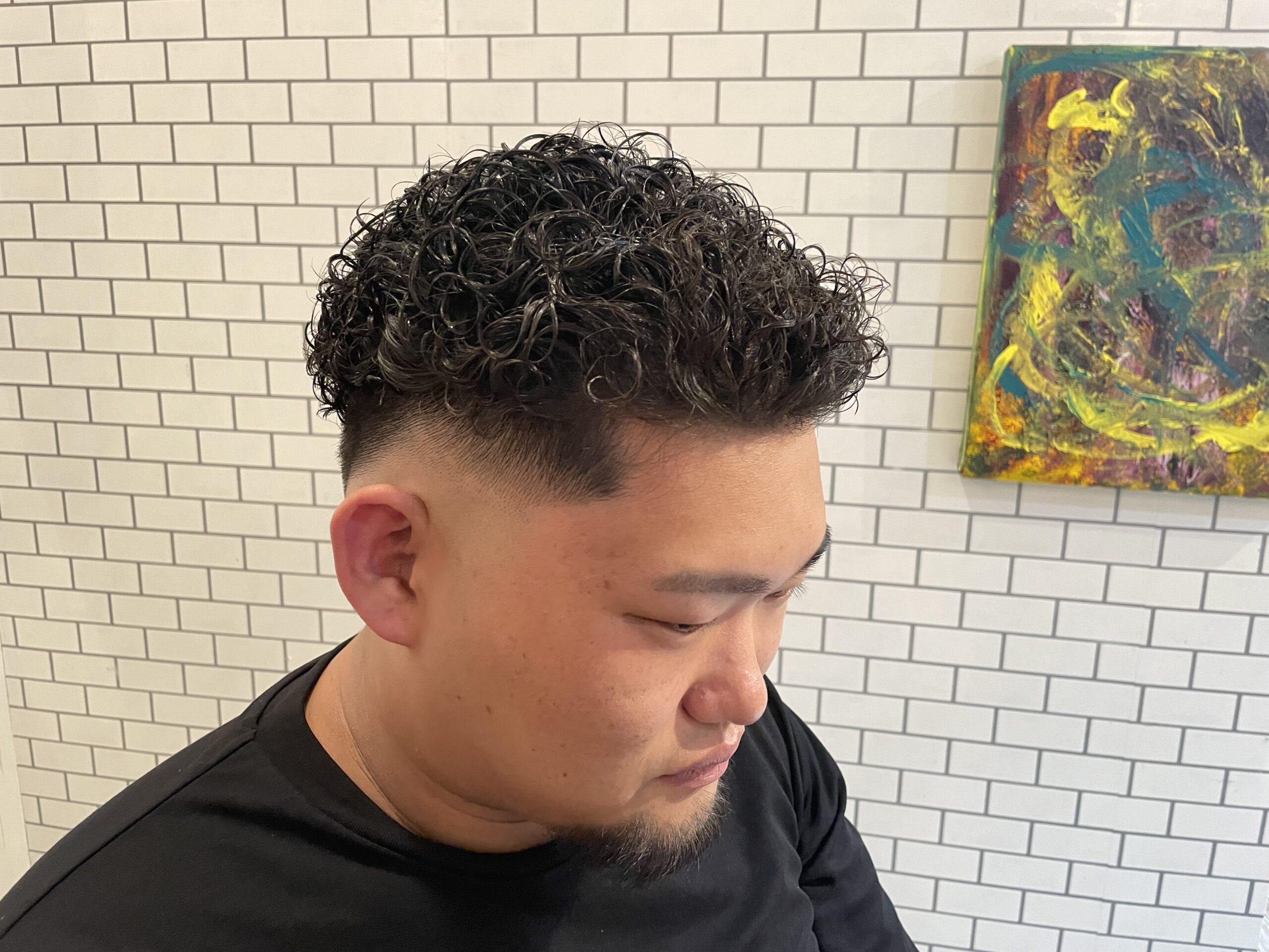 サイドをすっきり刈り上げ、トップの強いカールとコントラストをつけることで、より洗練された印象に仕上がります。フェードのグラデーションが極道パーマの立体感を際立たせ、まさにバーバースタイルの真骨頂。