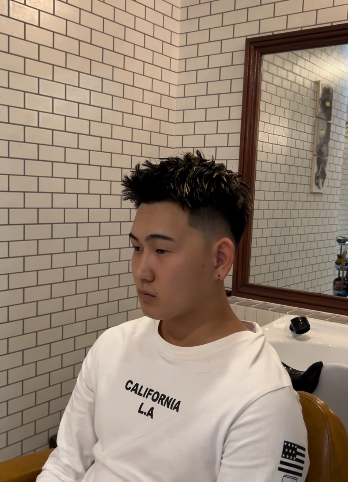 サイドはハイフェードで、トップは軽く前髪があげれるようにとハイライトを入れることで動きがわかりやすくなり、また普通のフェザーアップとは異なり、