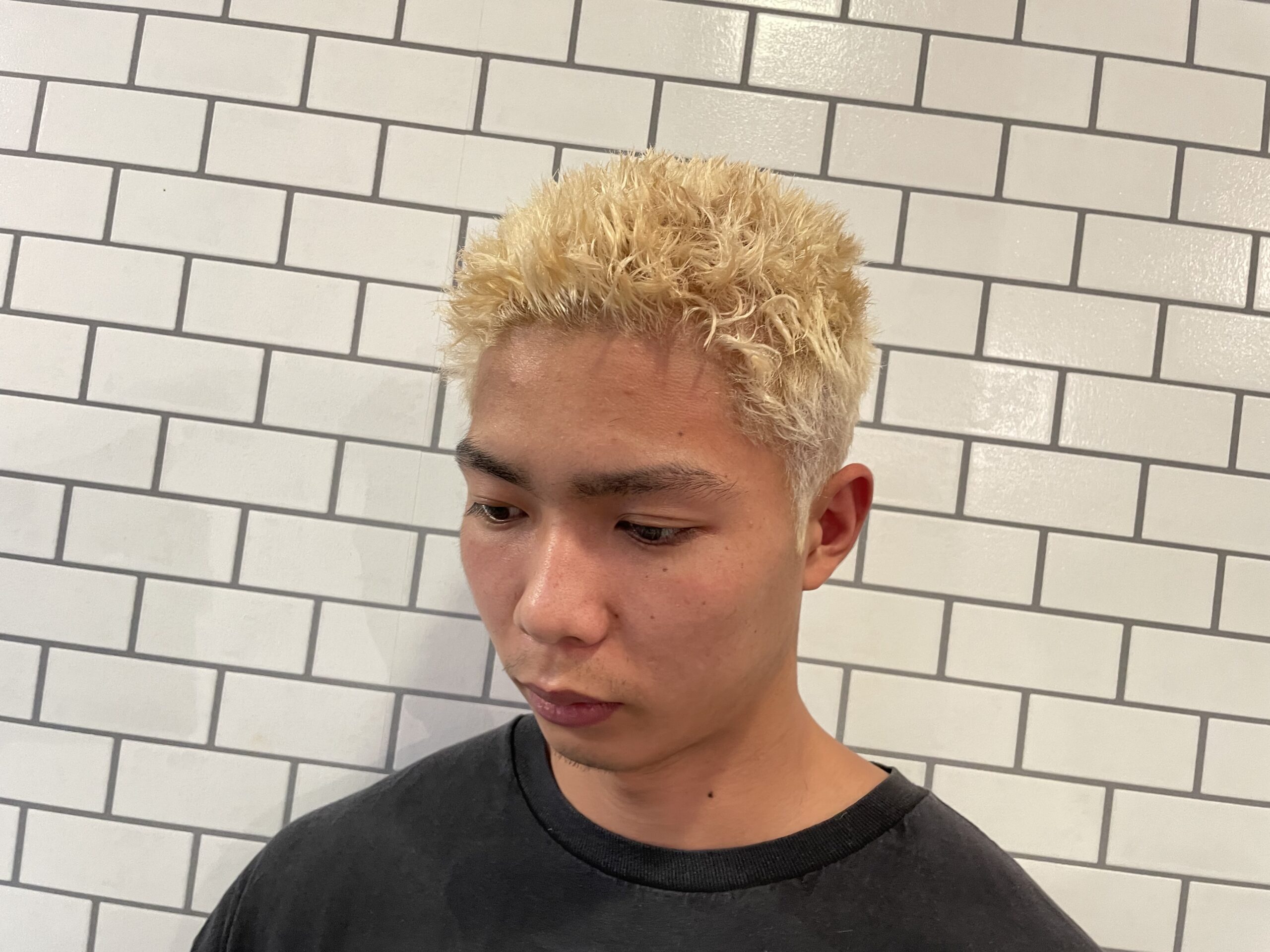 さらに今回は、全体にブリーチをプラス。黒髪よりも明るめの髪色にすることで、パーマの動きがより際立ち、立体感が強調されます。光の当たり方によって陰影がはっきり出るので、シンプルなスタイルでも存在感は抜群。まさに“攻めのショートスタイル”といえます。