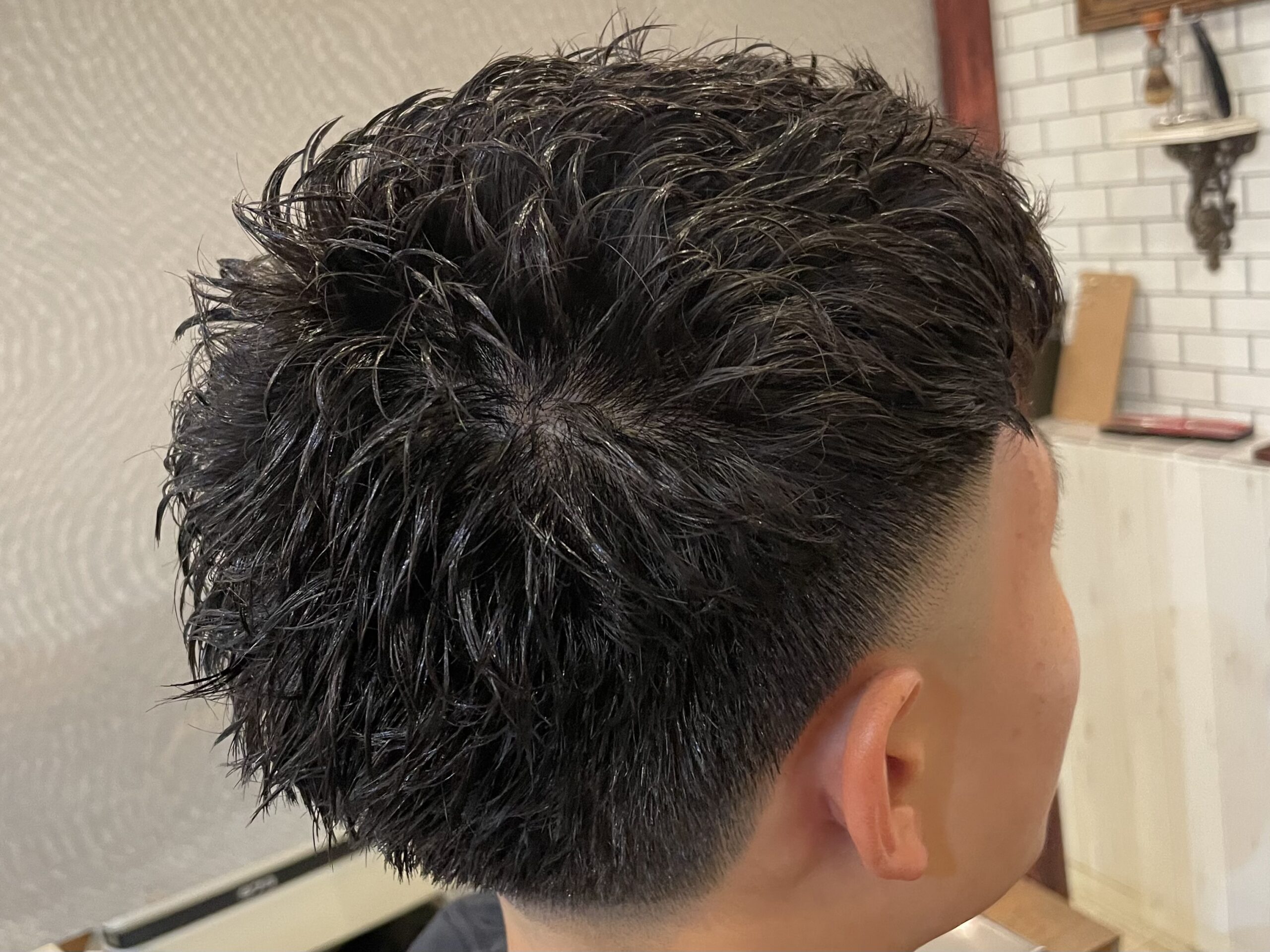 さらに、この「ラフアイロンパーマ」はテーパーフェードとの相性も抜群。サイドから襟足にかけてのフェードで清潔感を演出しつつ、トップの動きとのバランスを取ることで、全体のフォルムがより引き締まります。短髪ながらも立体的で男らしいスタイルが完成。トレンド感を出したい方にもピッタリです。