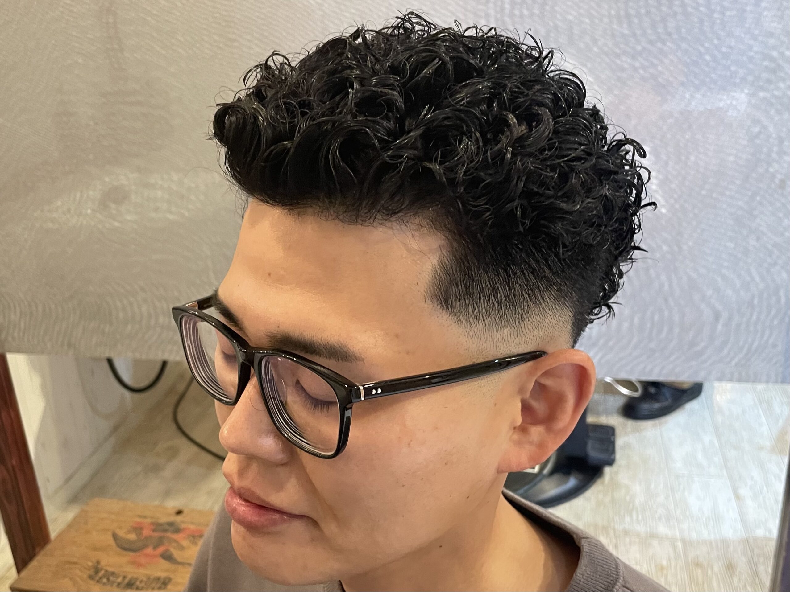 今回のデザインは、トレンドの スキンフェード を組み合わせた、清潔感と男らしさを両立した王道バーバースタイル。刈り上げ部分は0mmから滑らかに繋ぎ、トップはしっかり動くグリグリパーマで立体感をプラスしています。トップにボリュームが出にくい方や、直毛で動きが出ない方にも相性バツグンです。