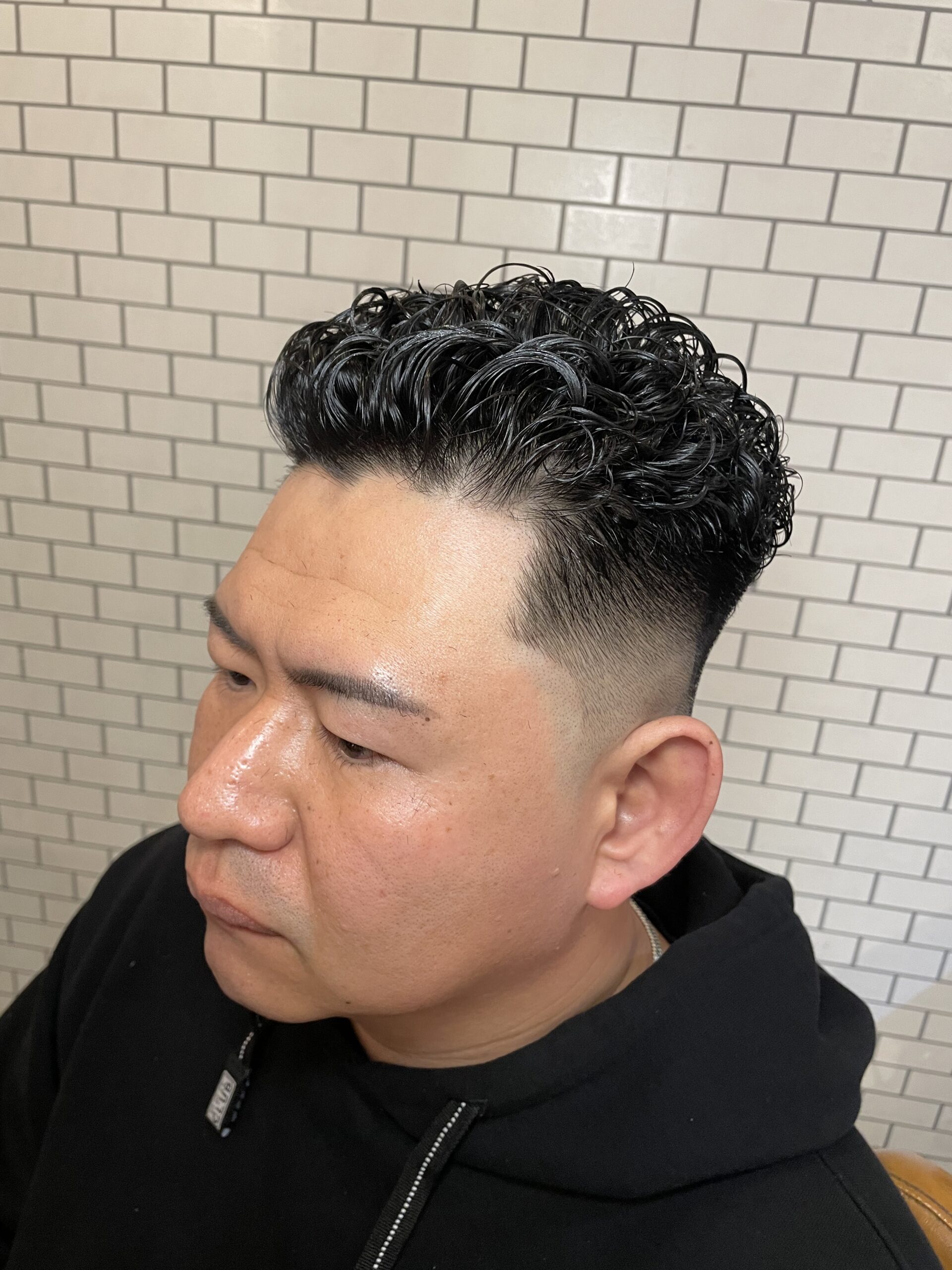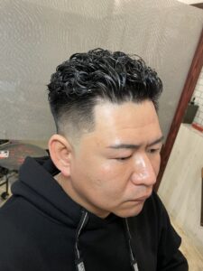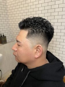 フェードのシャープなラインと、パーマの立体感が合わさることで、男らしく清潔感のある印象になります。