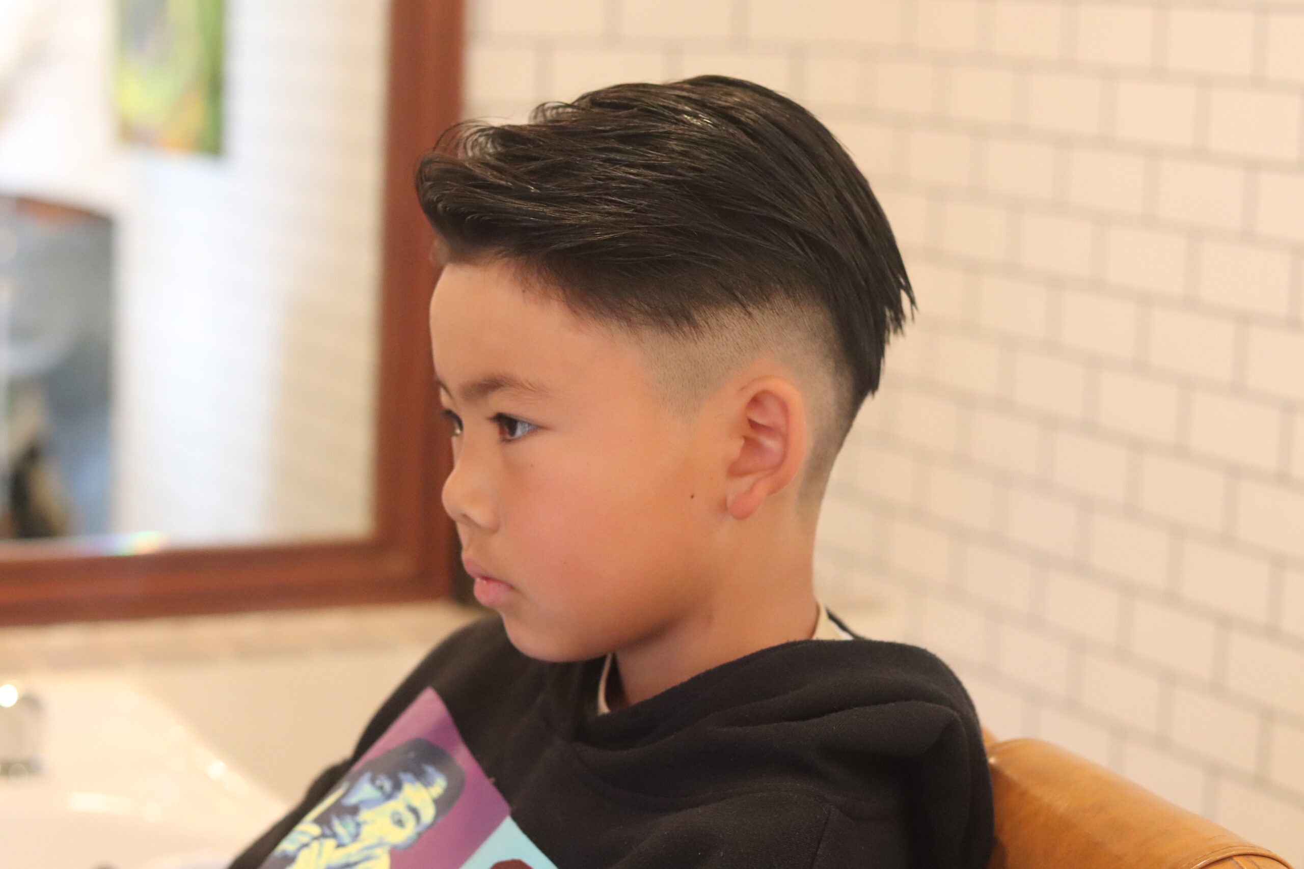 「7.3パートでフェードならバーバーがおすすめ!」と言われる理由は、刈り上げのグラデーションの美しさとバランス。THIRD PLACEでは、お子さまの髪質や骨格に合わせて丁寧にフェードを作り込み、ナチュラルなのにしっかりとキマるスタイルをご提案しています。前髪を流して整えることで、子どもらしさの中にも大人っぽさがあり、周りと差がつくヘアスタイルになります。