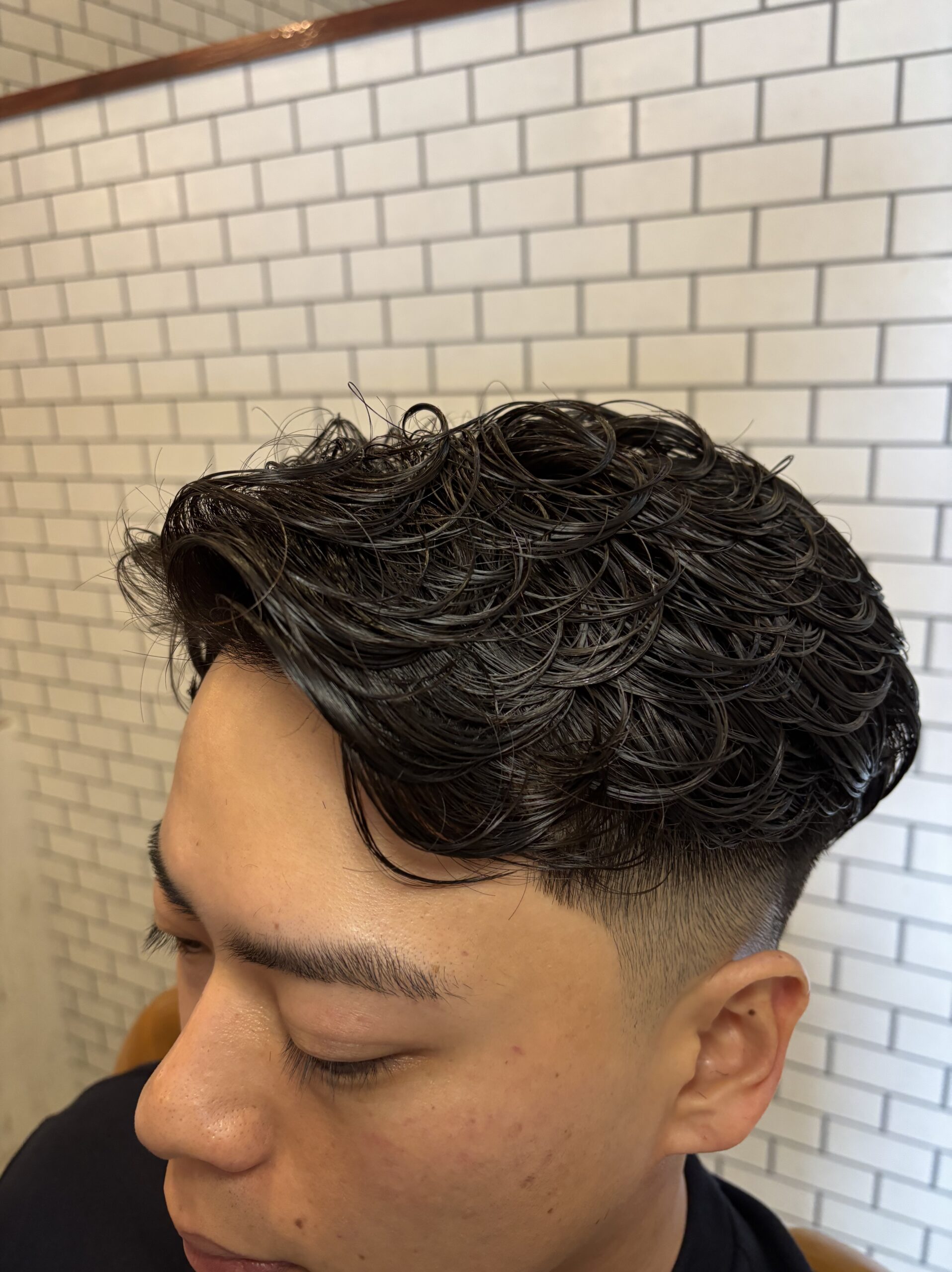 横はフェードでスッキリと刈り上げ、上はパーマを当てワンカールで後ろに流れるようなスタイルを作らさせて頂きました。