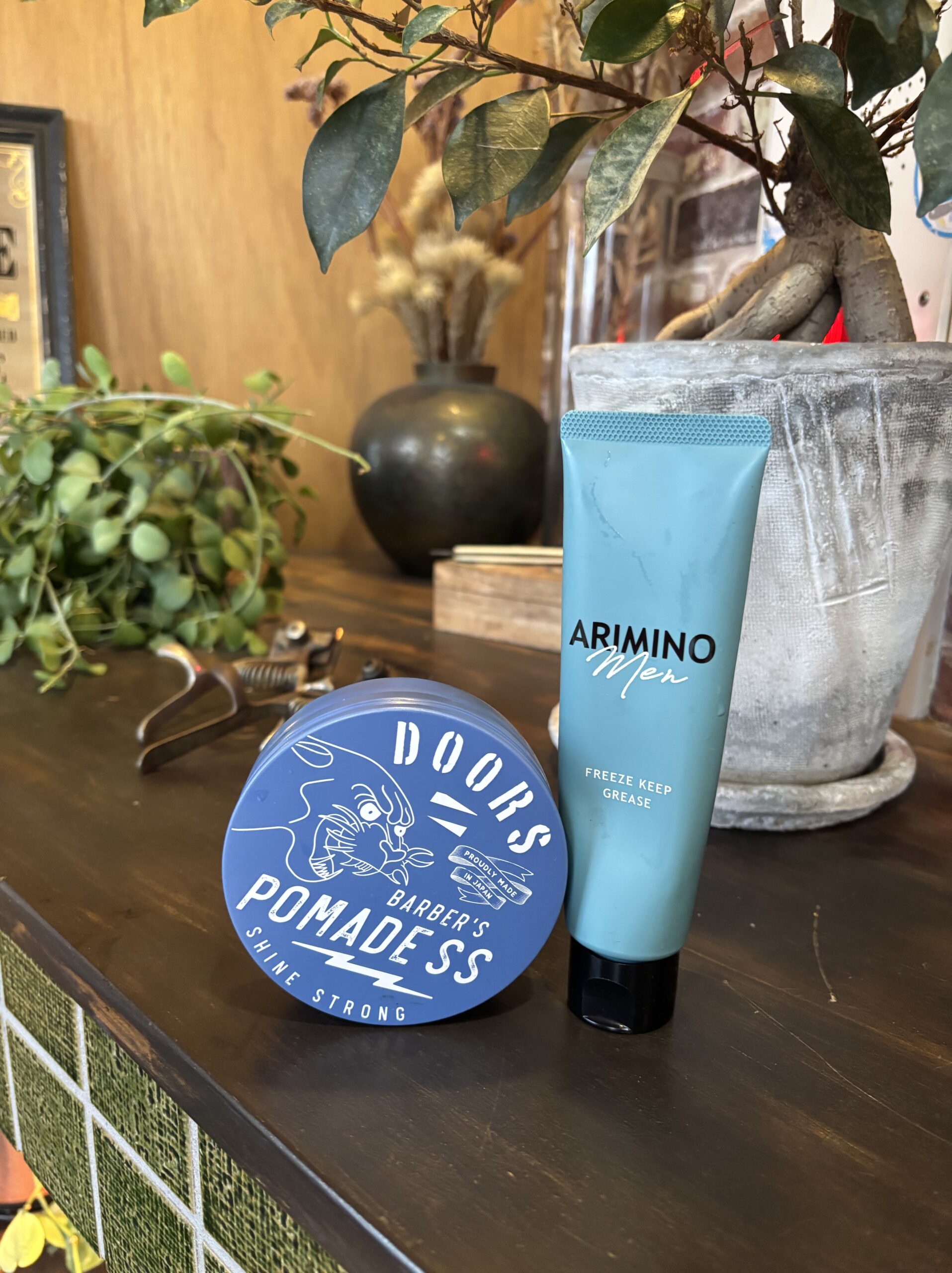 特に左のポマードは匂いとつやがメインとなっており、人気の整髪料となっております!