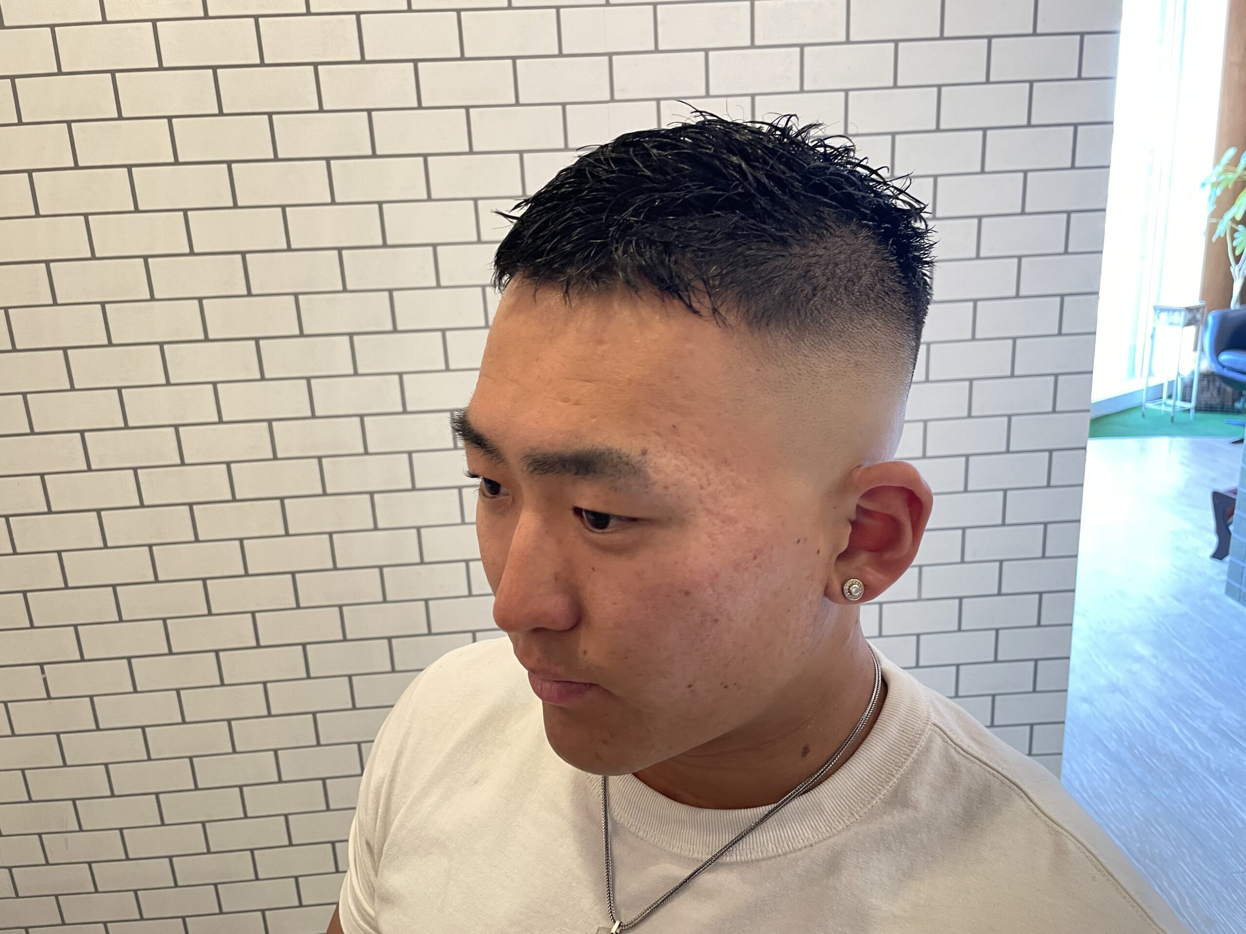 「もう暑いんで短めが人気です!」という言葉の通り、最近はサッパリとした短めスタイルをオーダーされるお客様がとても増えています。クロップスタイルは前髪を短めに整えたスタイルで、清潔感と男らしさを兼ね備えたバーバースタイルの代表格。ベリーショートにすることで、さらに爽やかさと扱いやすさがアップします。