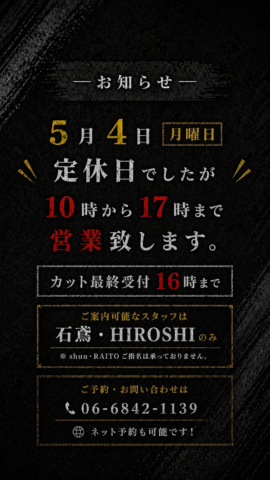 本来、定休日を予定しておりましたが5月4日(月・祝)は特別営業いたします!